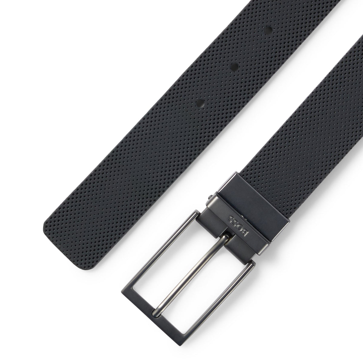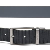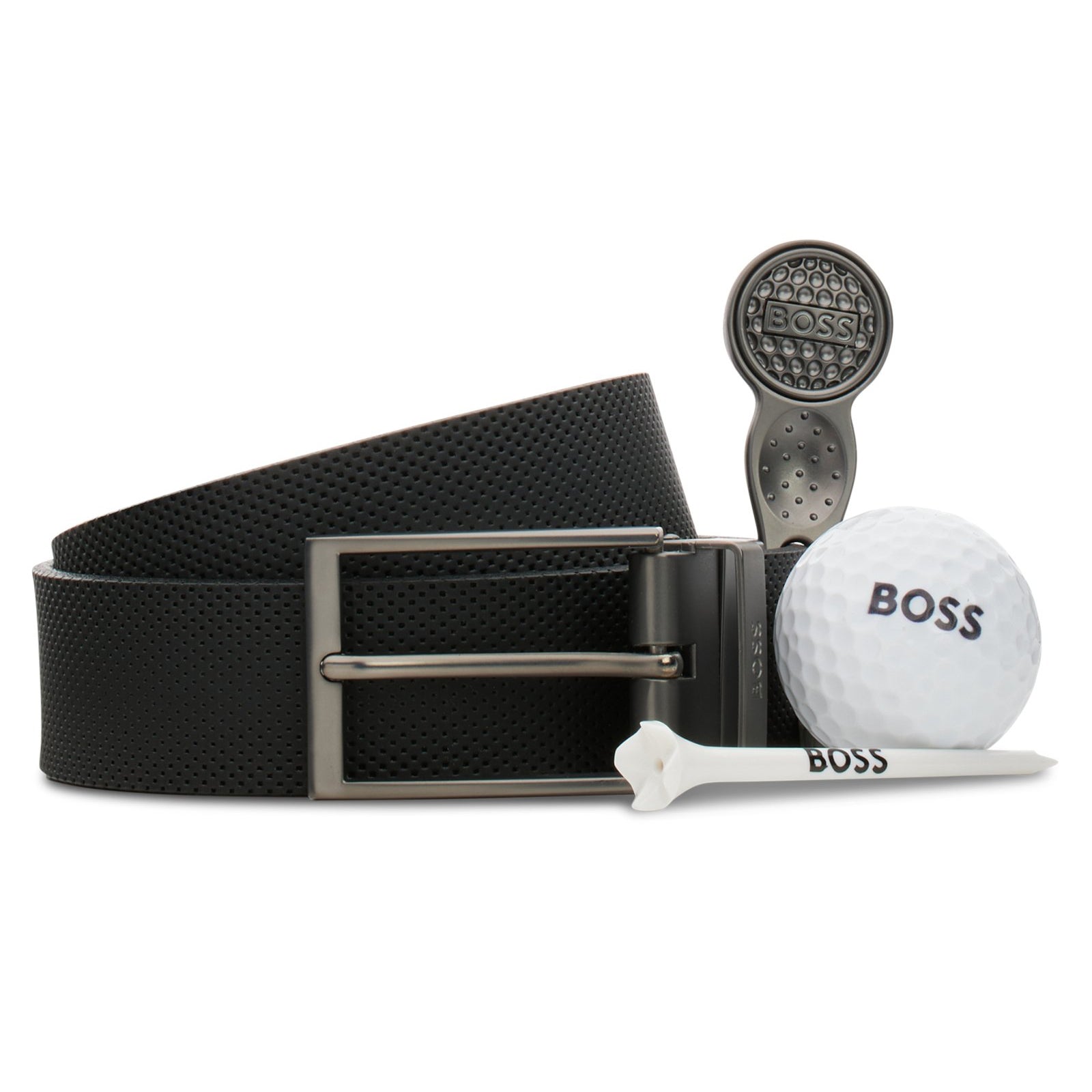 A modern gift set by BOSS, comprising a reversible 3.5cm belt in Italian leather, branded golf tees, a logo ball and a signature divot-repair tool.