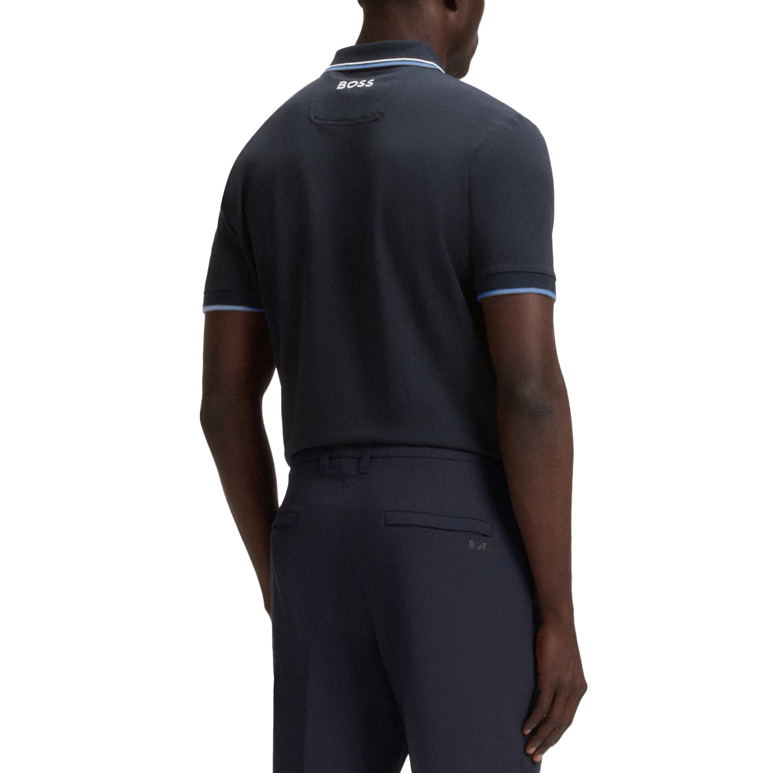 A distinctive polo shirt cut to a regular fit, by BOSS Menswear. Featuring contrast branding at the left chest and back neck, this short-sleeved polo shirt is designed in fabric with S.Café® and stretch for casual comfort. 3D stripes add a sporty touch at the collar and cuffs. S.Café® fabric is made from coffee grounds, transformed by a patented process into a special yarn. This fabric provides exceptional wearing comfort coupled with permanent performance benefits including fast drying and odor control.