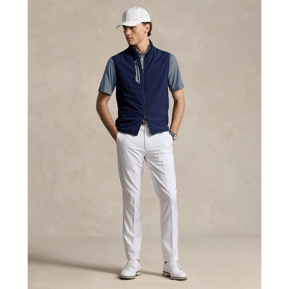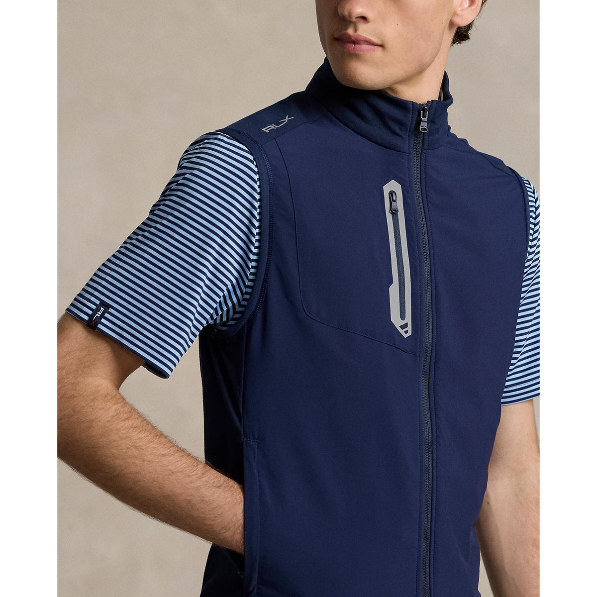 Key Features: -Tailored Fit: Size medium features a 26.5" body length, 18" shoulder width, and a 43" chest for a sleek, athletic silhouette. -Performance Design: A mock neck and two-way full-zip front offer customizable comfort. -Functional Storage: Secure your essentials with a right chest zip pocket and side on-seam zippered pockets. -Signature Details: The iconic "RLX" logo is printed on the right shoulder and center back neck for a premium touch. -Comfort & Flexibility: Stretch binding at the armholes and hem ensures a snug yet flexible fit. -Premium Fabric Blend: Crafted from a soft and breathable mix of cotton, polyester, and elastane, with a polyester-elastane front panel for enhanced durability. -Easy Care: Machine washable for effortless maintenance. -The model is 6'1" (185 cm) and wears a size medium.