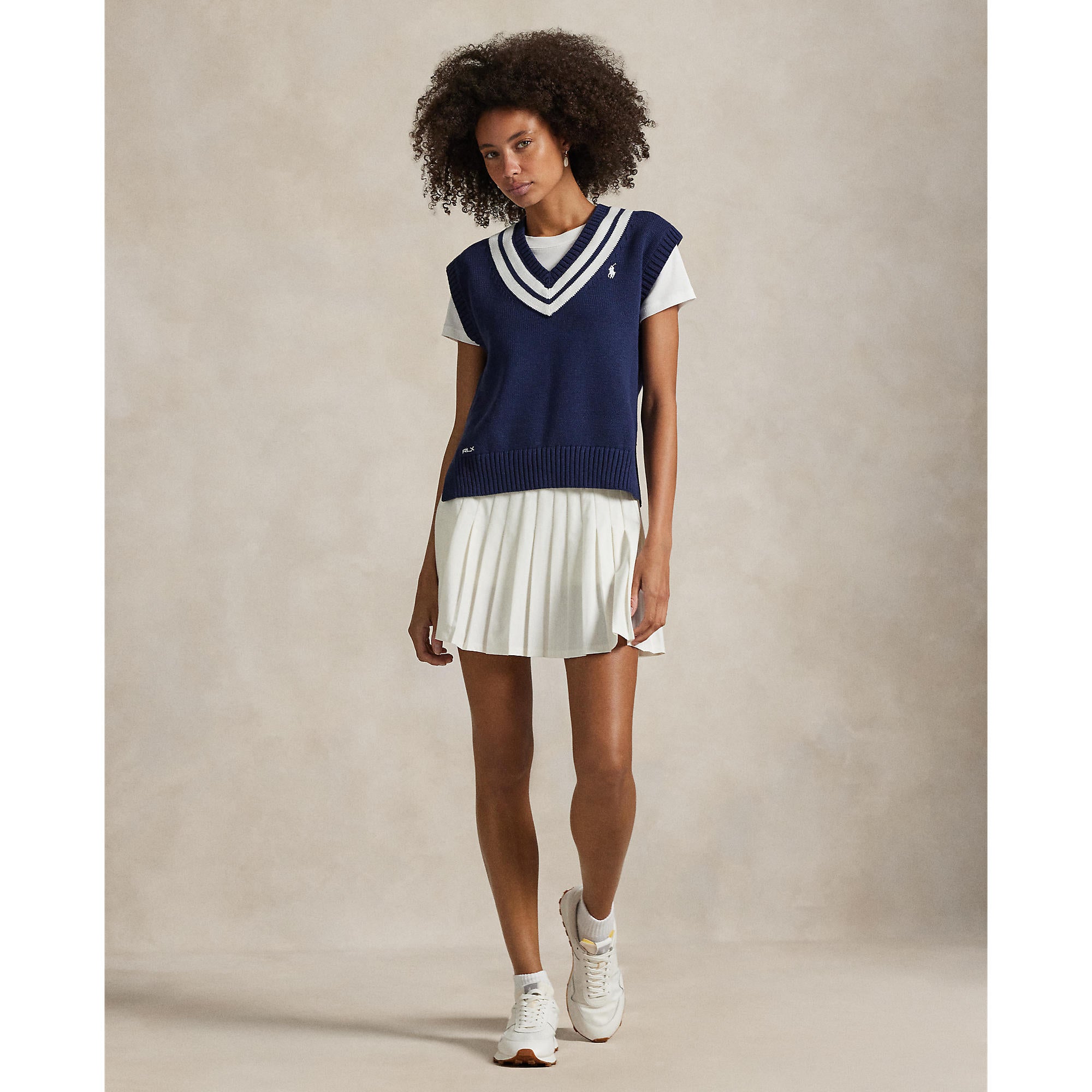 Striped Rib-Knit V-Neckline Adds a classic cricket jumper-inspired touch with contrast detailing.