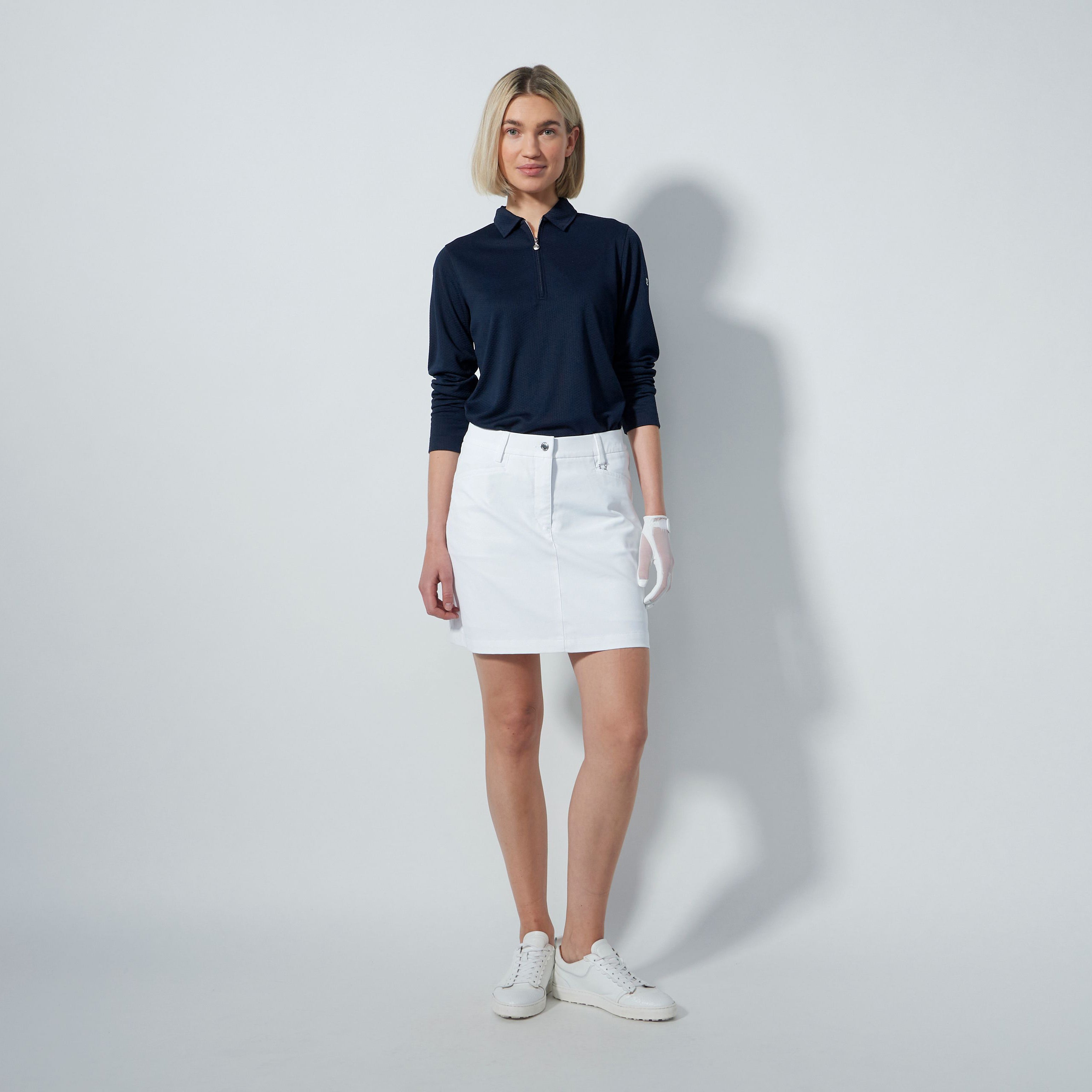 Mia Mid Golf Skirt kombinerar sportig funktionalitet med modern stil. Dess smickrande A-formade passform, mjuka återvunna tyg och inbyggda shorts gör den till en mångsidig häftklammer, perfekt för aktiva dagar på kursen eller utan ansträngning till vardags.