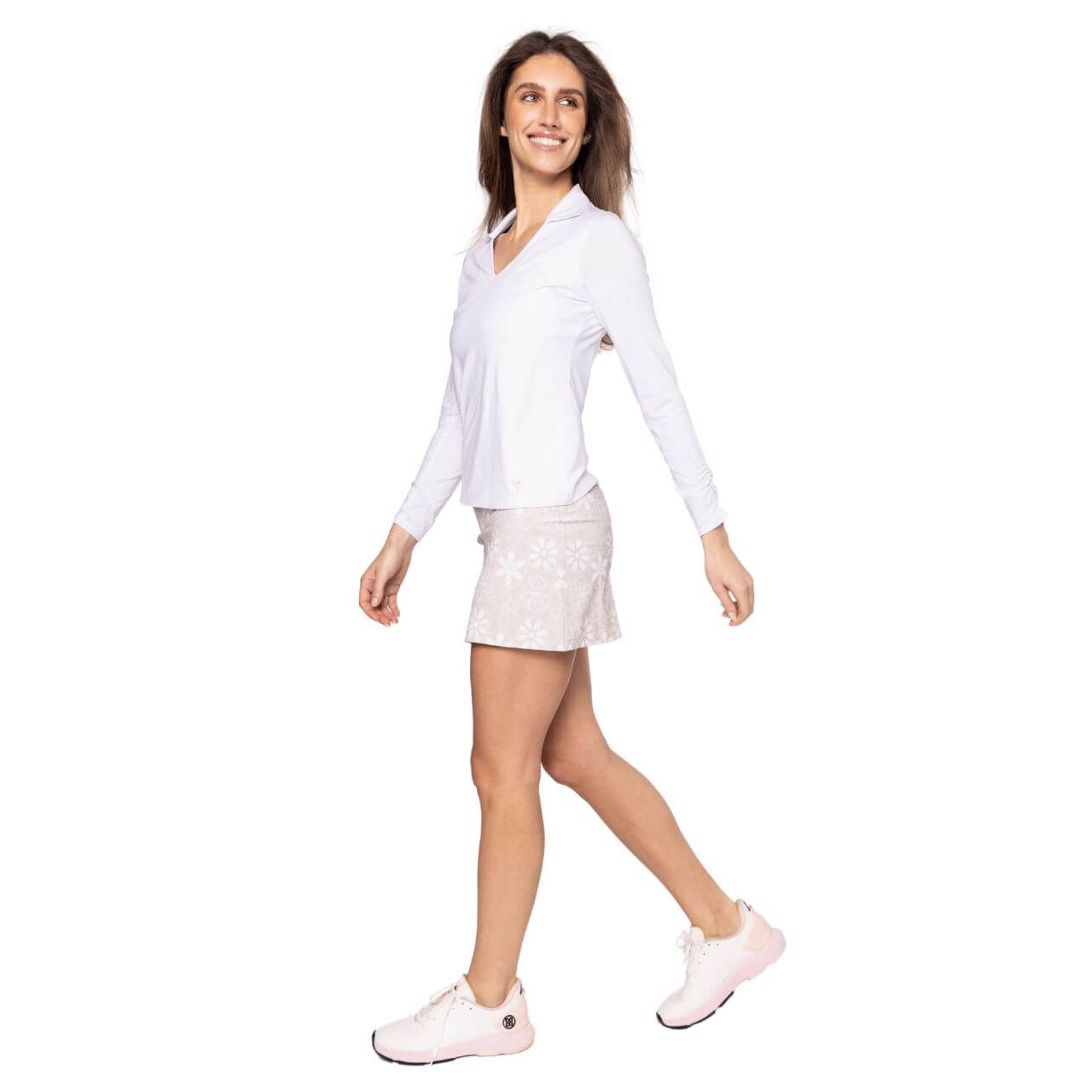 The Golftini Women’s Pull On 17.5" Golf Skort in Sand Bar combines effortless style with high-performance functionality. Designed in a khaki and white floral print, this pull-on skort is crafted from a new nylon blend that delivers lightweight breathability, 4-way stretch, and moisture-wicking comfort. Complete with matching undershorts and convenient pockets, it’s a versatile piece that transitions seamlessly from the kurs till vardagskläder.