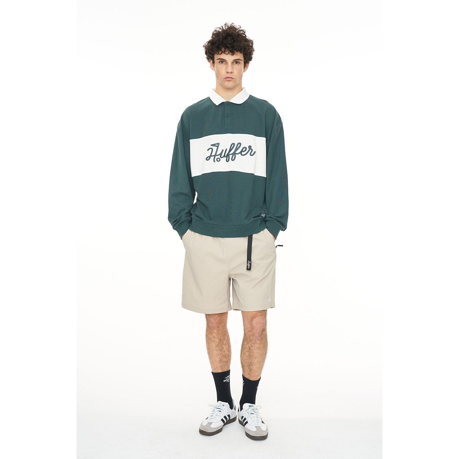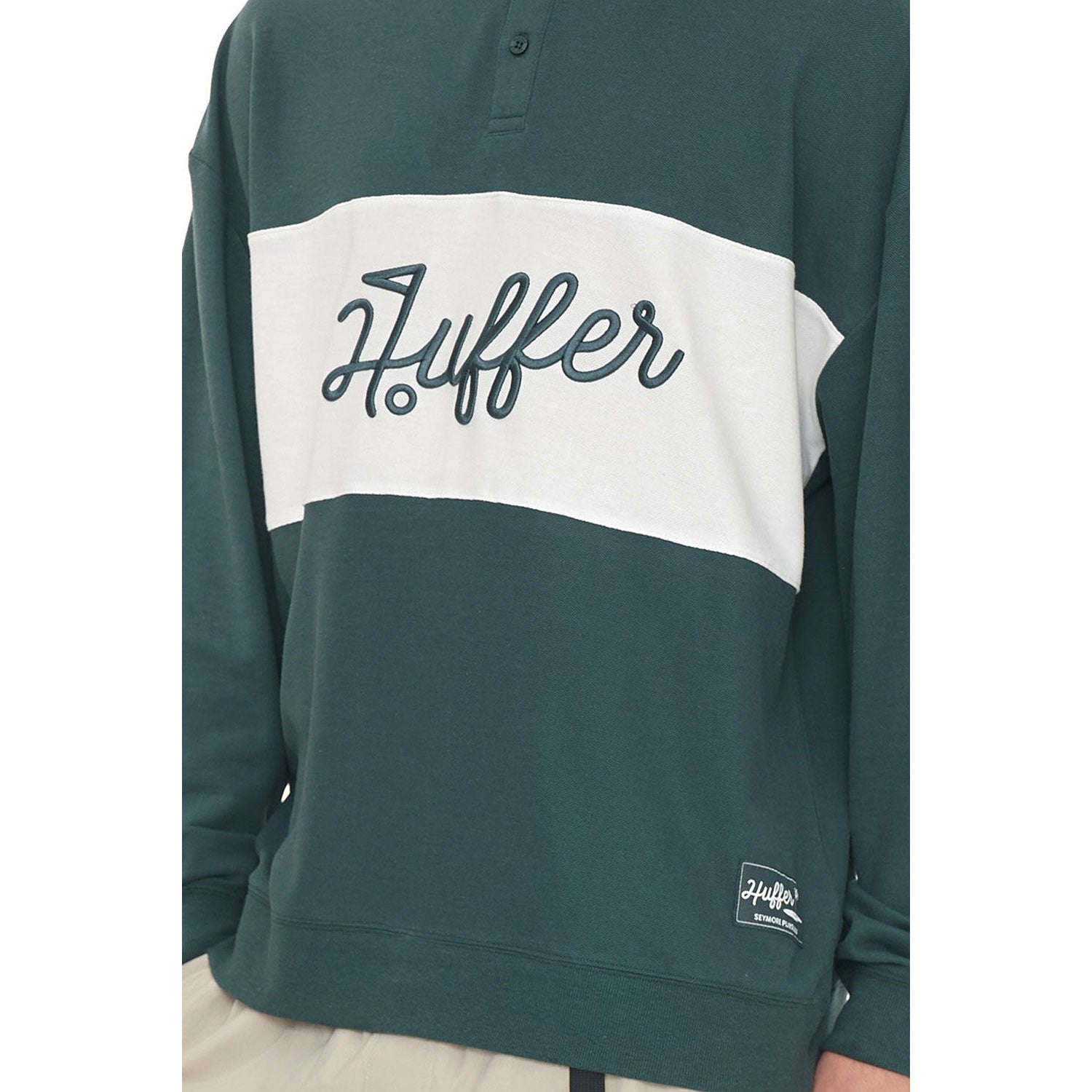 Här är vad du bör veta: 245gsm 60% Bomull 40% Polyester Pique, en Boxy streetwear-passform med djärvt Huffer-vapenbroderi - som ger banans karaktäristiska Huffer-energi.