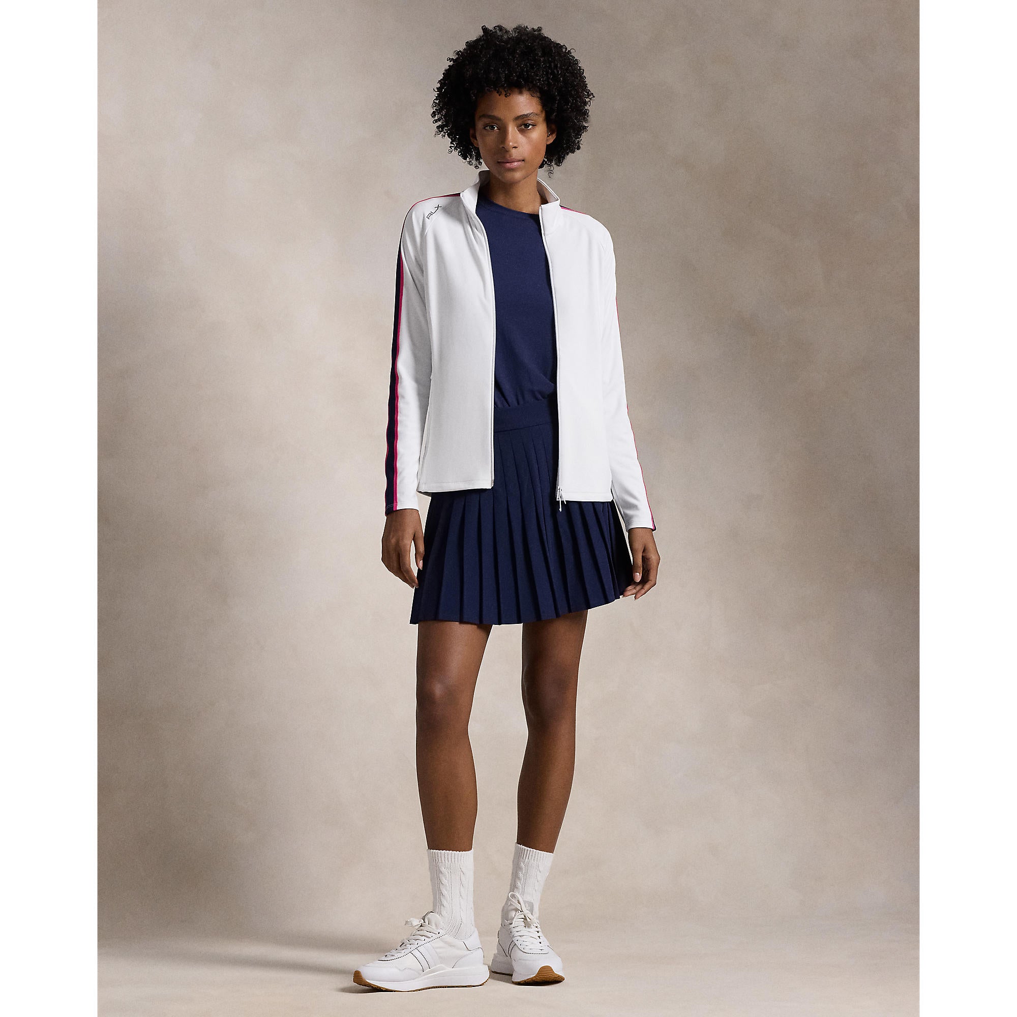 RLX Ralph Lauren Women's Power Stretch Mockneck Zip Jacket i Ceramic White Multi är utformad för att blanda prestanda med stil. Genom att erbjuda en något smal passform med generös stretch säkerställer denna jacka obegränsad rörelse samtidigt som man håller ett elegant, aktivt utseende. Utformad från ett mjukt persikat tröja tyg är det idealiskt för både sport och casual wear.