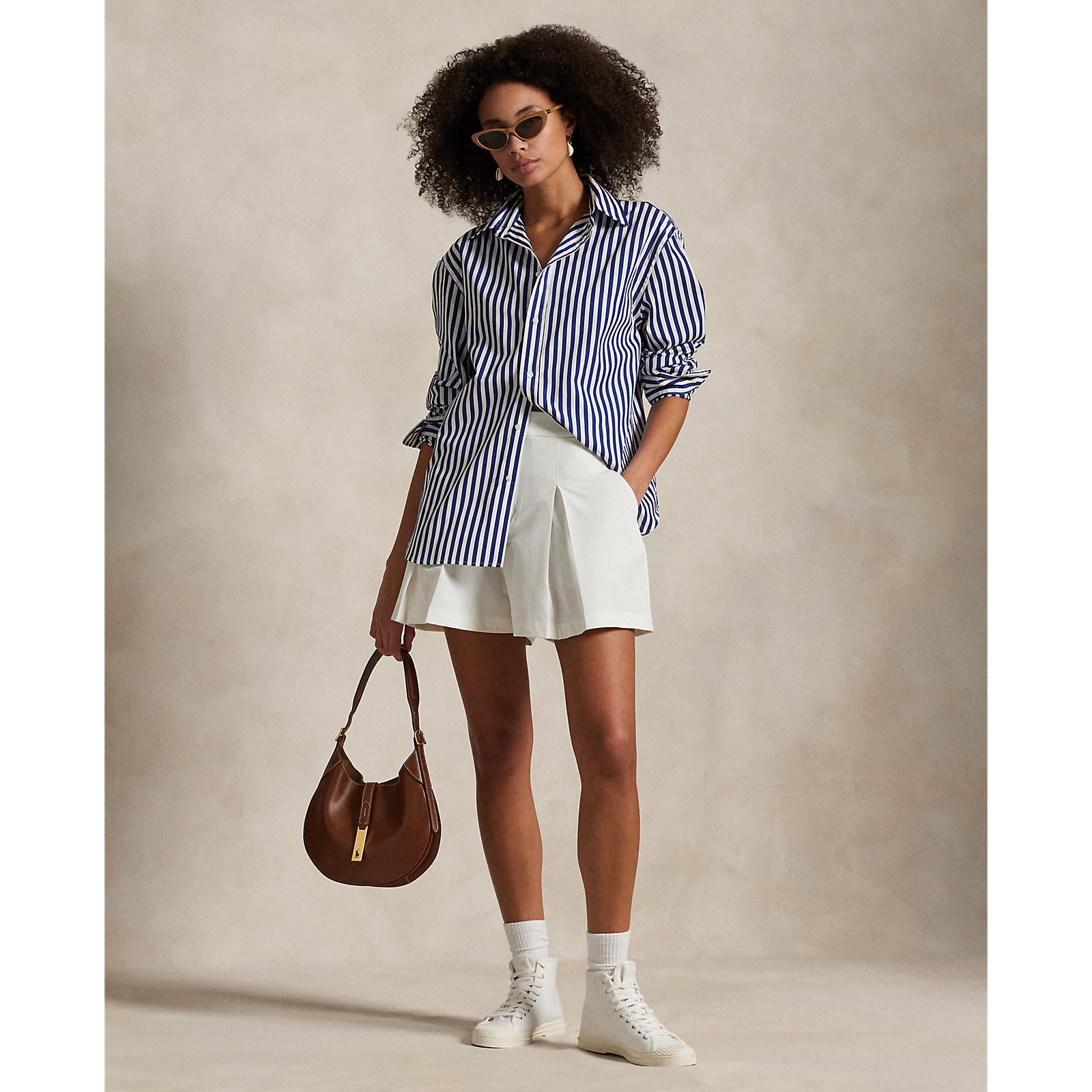 宽腿轮廓:前面的盒褶创建体积,同时保持抛光,量身定制的外观。